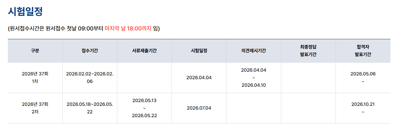 1차 시험 원서접수는 2026년 2월 초에 진행되며, 시험일은 2026년 4월 4일로 공지되었습니다. 1차 합격자 발표는 2026년 5월 6일 이후 이루어질 예정입니다.