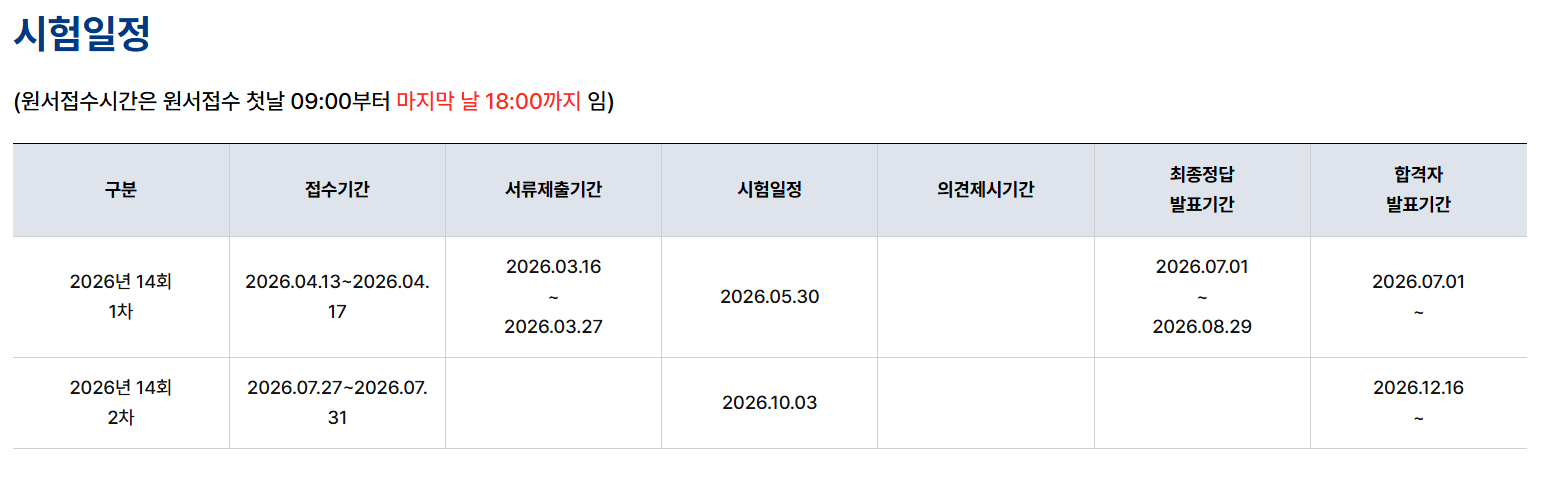 1차 시험은 2026년 5월 30일에 시행될 예정이며, 원서접수는 4월 중순에 진행됩니다. 1차 합격자 발표는 7월 초부터 확인할 수 있습니다.